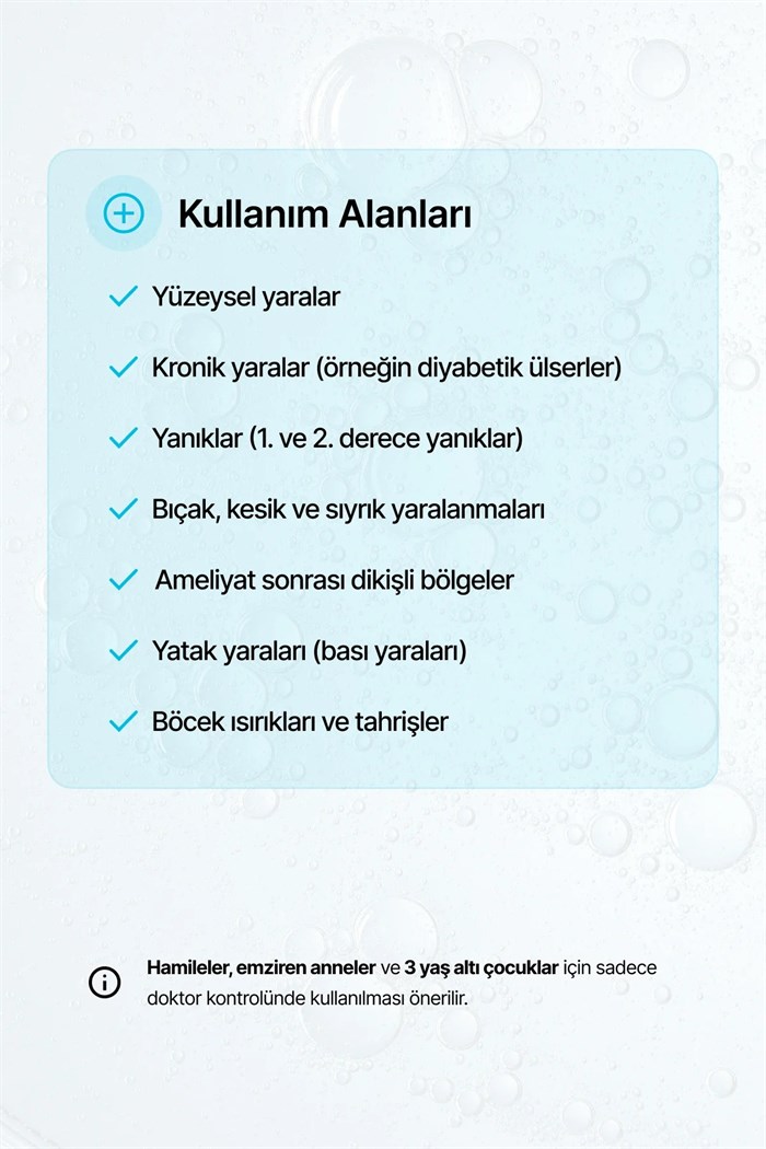 - Yüzeysel , akut ve kronik deri lezyonlarının tedavisinde yardımcı ürün olarak kullanılır.