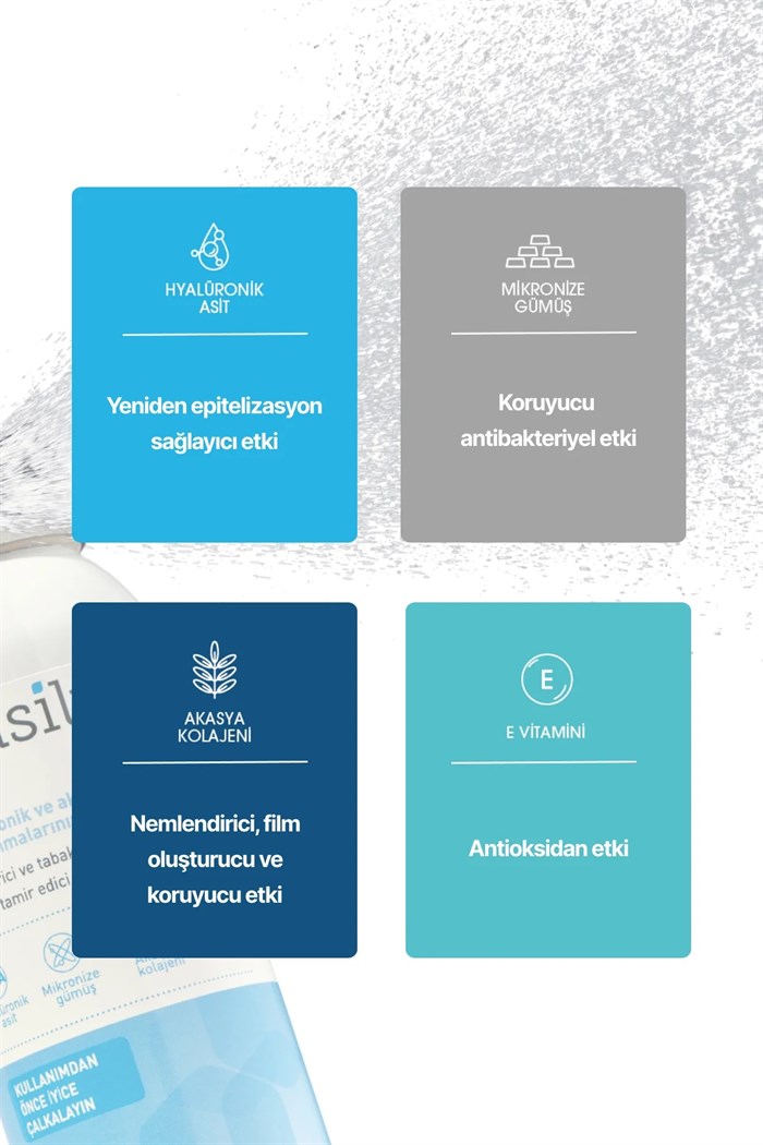 - Hyalüronik asit, mikronize gümüş, akasya kolajeni, E vitamini ve yardımcı maddeler içeren topikal kullanıma uygun süspansiyon spreydir.