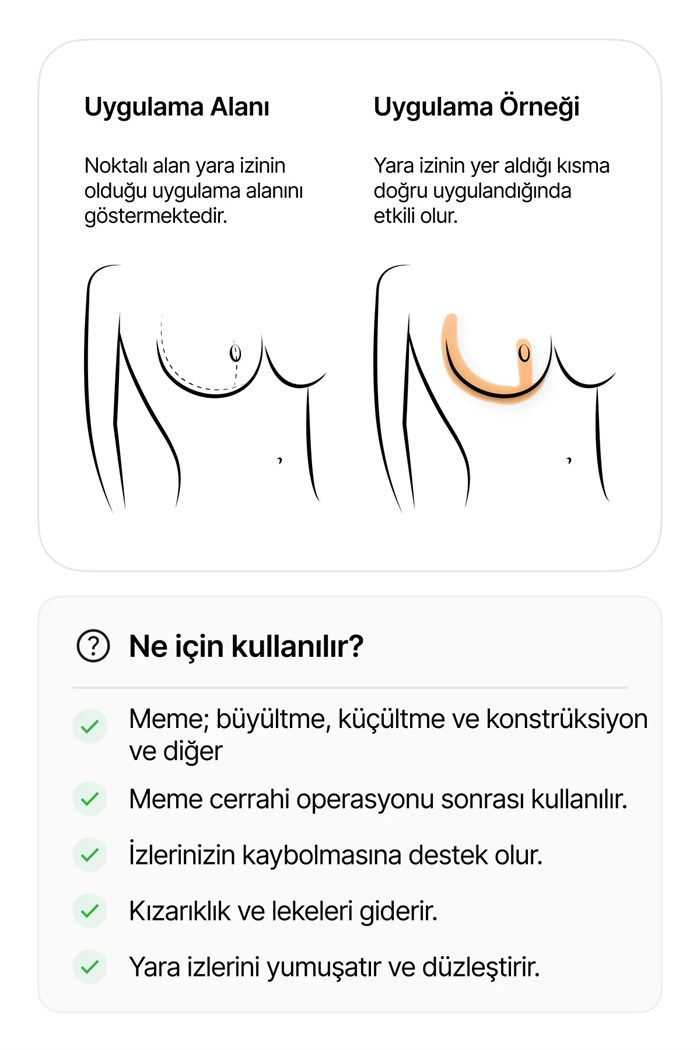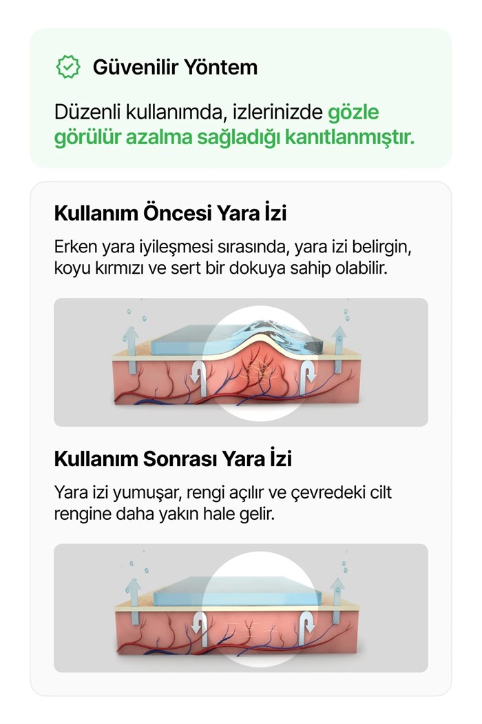 Kullanım Talimatları: Cildinizi temizleyin ve iyice kurulayın. Pansumanı yara izinin üzerine yerleştirin ve düzgün bir şekilde yapıştırın.