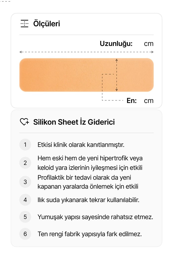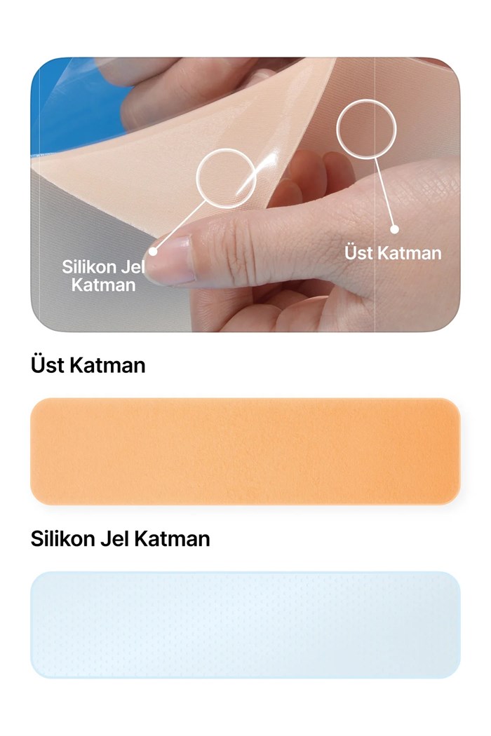Bu yumuşak, ince, tekrar kullanılabilen ve kendinden yapışkanlı silikon jel tabaka, esas olarak silikondan yapılmıştır. Hem mevcut hem de yeni oluşan hipertrofik veya keloid skarların yönetiminde kullanıldığı gibi iyileşme sürecindeki yaralarda hipertrofik veya keloid skar oluşumunu önlemek için profilaktik bir tedavi olarak da etkilidir.