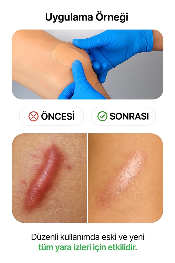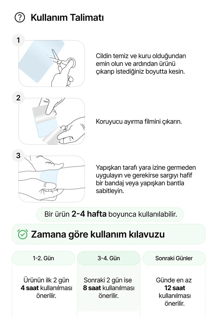 Kullanım Talimatları: Cildinizi temizleyin ve iyice kurulayın. Pansumanı yara izinin üzerine yerleştirin ve düzgün bir şekilde yapıştırın.