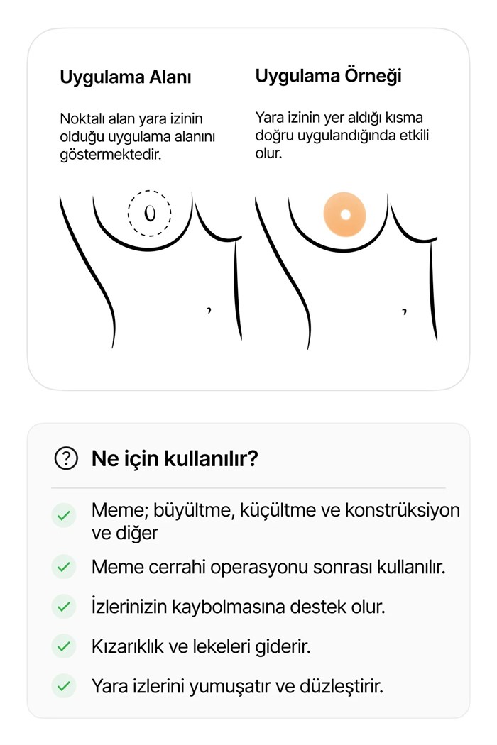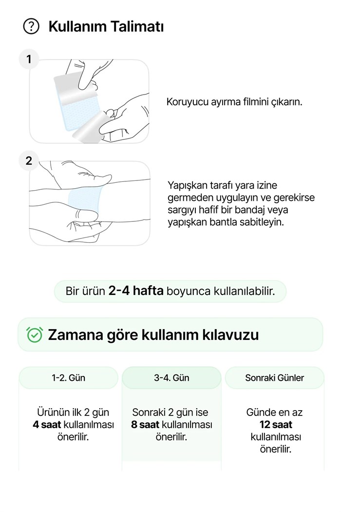 Kullanım Talimatları: Cildinizi temizleyin ve iyice kurulayın. Pansumanı yara izinin üzerine yerleştirin ve düzgün bir şekilde yapıştırın.