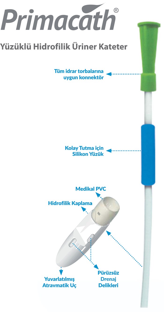 PVC den üretilen katetere hidrofilik özellikte solüsyon ile kaplanması sonucunda hidrofilik üriner kateterler oluşmaktadır. Hidrofilik özellikte solüsyon ile kaplanan kateterler yüzük aksesuarı ile işlem görür ve yanına ürünün hidrofilik özelliğini aktifleştirebilmek için su soketi konularak laklı medikal kâğıt(medical paper) ve PE(polietilen) filmden oluşan paketlerde paketlenip HİDROFİLİK ÜRİNER KATETER YÜZÜKLÜ olarak piyasaya sunulmaktadır. Yüzüklü kataterlere yüzük aksesuarı ile kullanılır. Yüzük aksesuarı kateter yüzeyine temas edilmemesi için kullanılır. Ürün etilen oksit gaz sistemi ile steril edilir. Ürün 30 adet olmak üzere iç kutulara, 6 iç kutu olmak üzere dış kolilere konulduktan sonra piyasaya arz edilir. Tek kullanımlıktır.